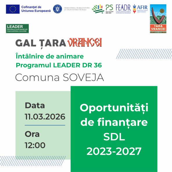 În preambulul lansării apelurilor de selecție din cadrul SDL 2023-2027, GAL Țara Vrancei organizează o întâlnire de animare în Comuna Soveja – Sala de Ședințe a Primăriei Soveja pe data de 11.03.2026, începând cu orele 12:00.